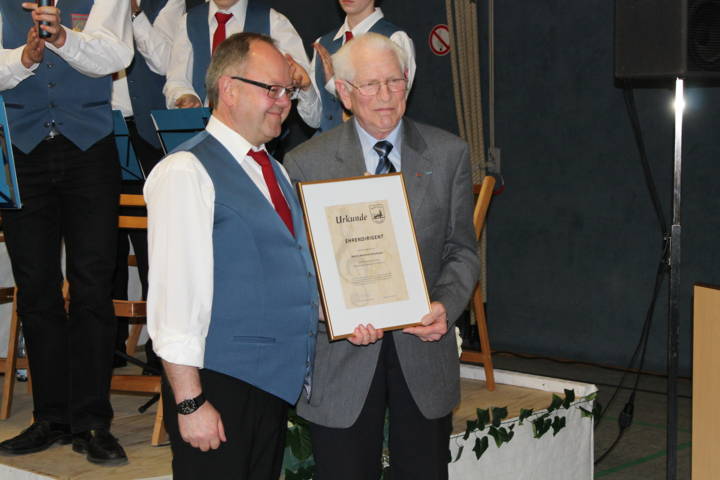 Heinrich Elixmann wurde nach der Pause vom 2. Vorsitzenden H.-W. Michallek zum Ehrendirigenten ernannt. Er war der erste Dirigent und 16 Jahre für die musikalische Leitung verantwortlich.